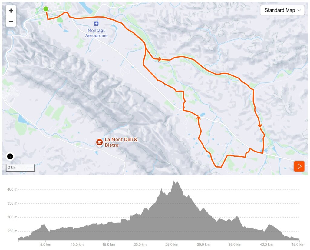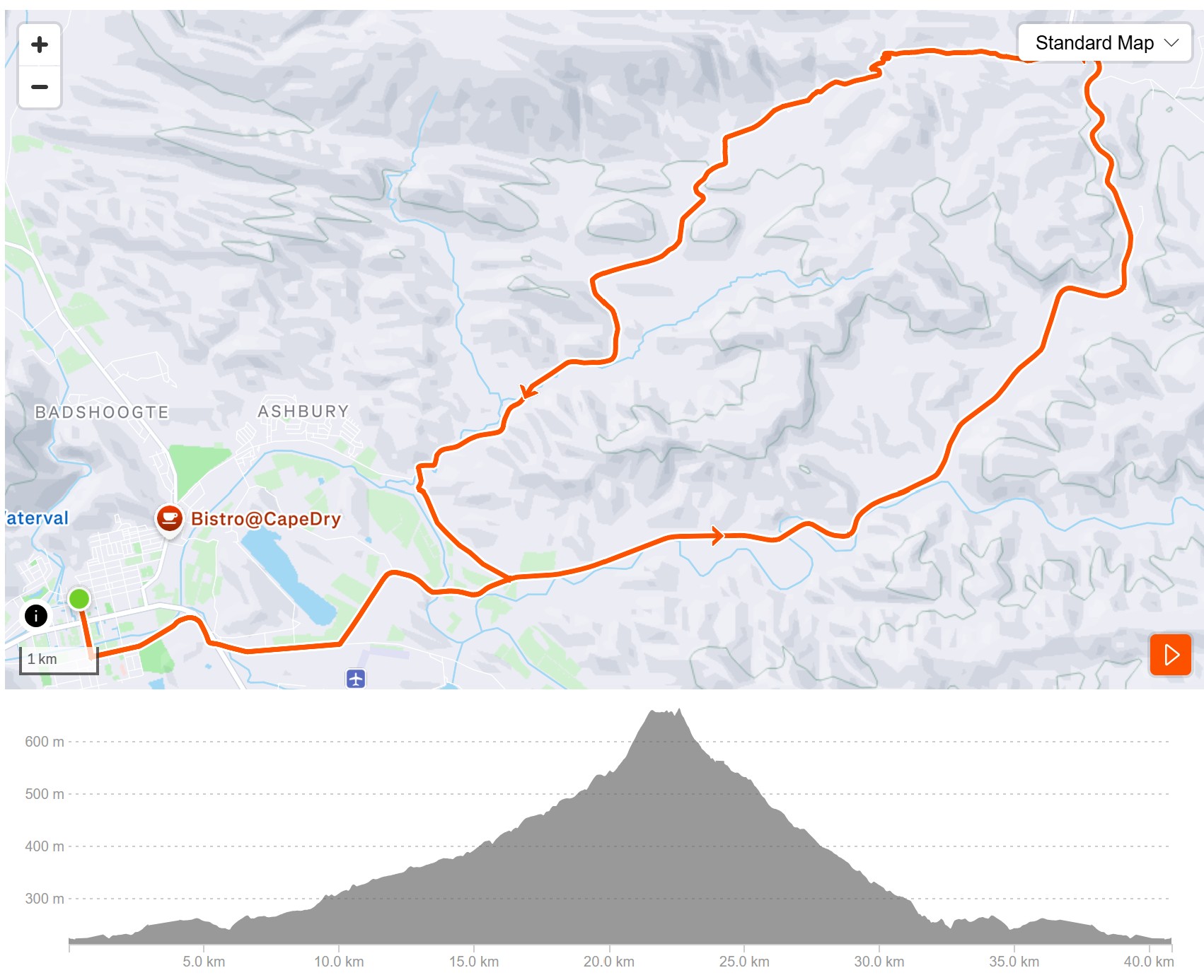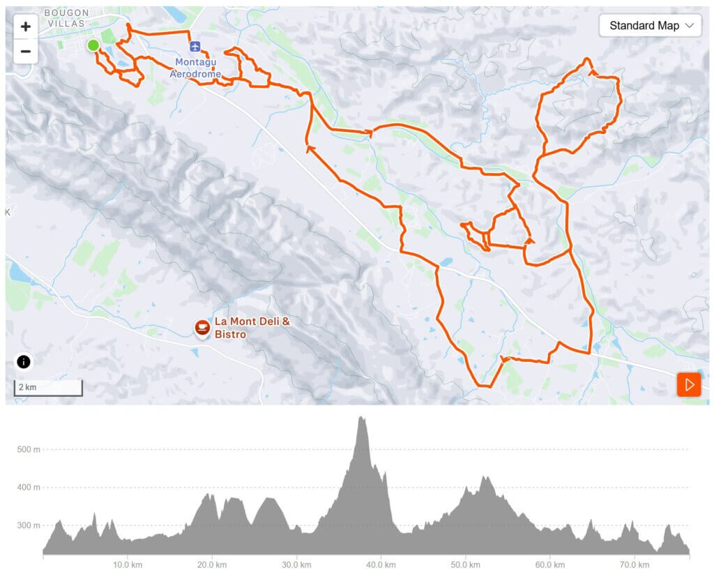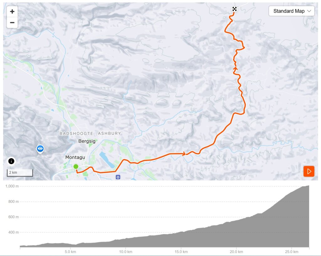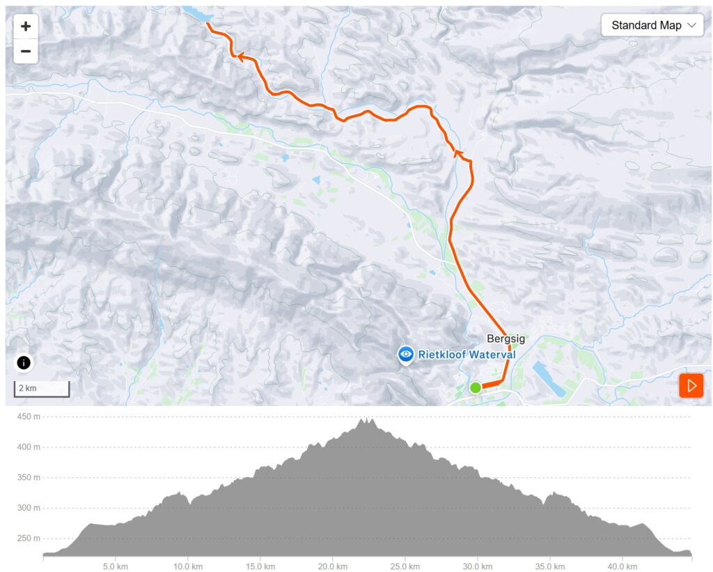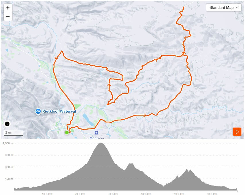 This is the ride for the hard-core rider wanting to get in that much-required hill training. It is a good idea to use a Camelbak for this one. The return trip is fast and caution is required on the descent down the Ouberg Pass with sharp corners and plenty of washboard surface.