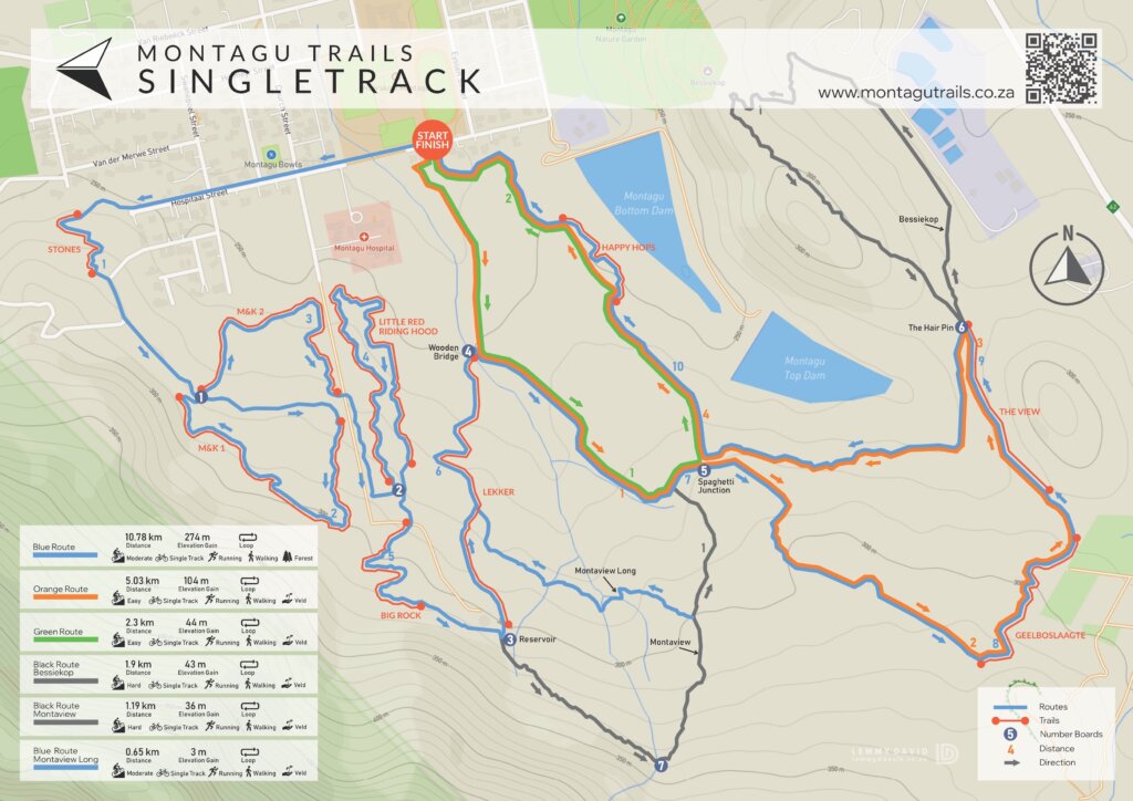 Our singletrack is located behind the hospital on the mountain side of Montagu South. There is a Park & Ride behind the Montagu High School in Hospital Street and blue arrows indicate the way.