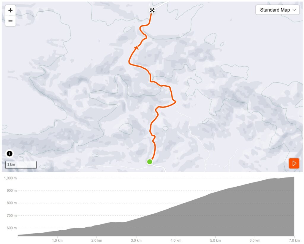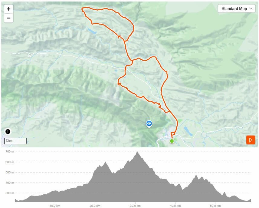 Distance is around 52 kilometers depending on your route back to town. It contains 38 bends, corners and curves within its 7,8 km length, with an altitude variance of 497m, producing an average gradient of under 1:16.