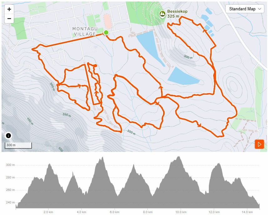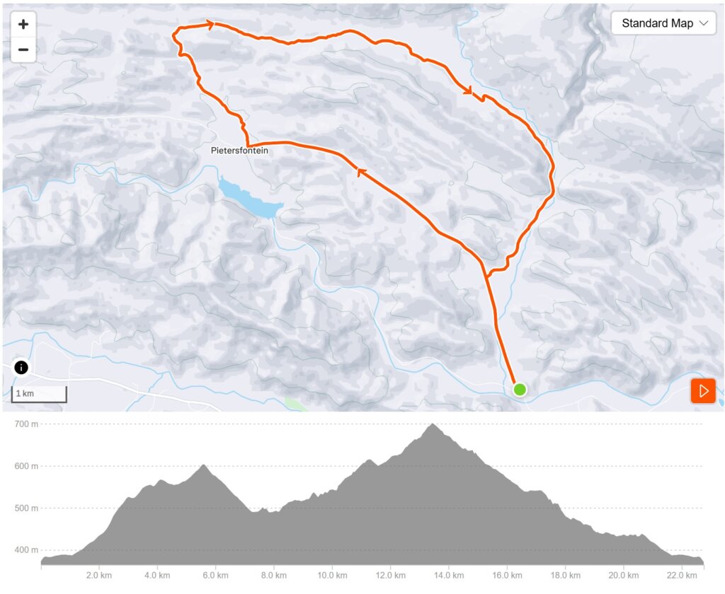 31km, gate Start of the Koenie Kloof Trail, tough 10km loop, 340m ascent