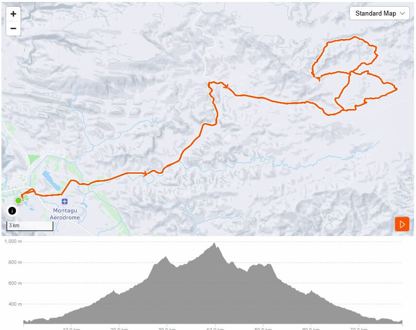 This is a flat and fast route ideal for families or riders wanting to do a time trial. There are a few rollers once you reach the turn-off to the Poortjieskloof Dam, six of them in fact if you want to count them before you reach the R62. There is a nice rest period for around 6 kilometres before turning back onto the dirt through Rietvlei No 1, and back onto the short section of tar on the narrow old section of the old Barrydale Road and onto the Talana Road back to town.